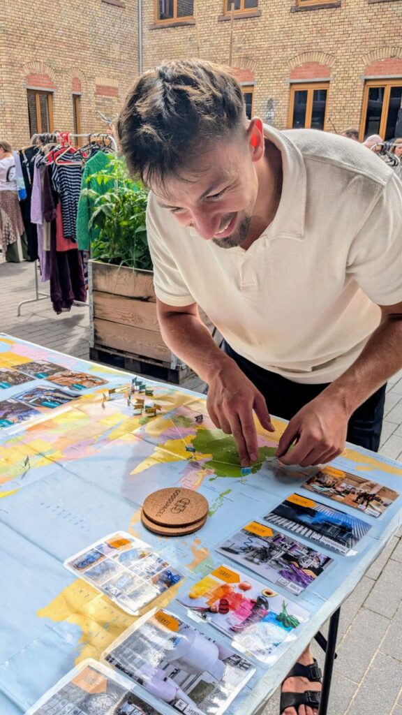 Am Bildungsstand von GloW Karlsruhe e.V. konnten sich die Besucher:innen intensiver mit der Ressource Textilien beschäftigen: Auf einer Weltkarte ließ sich die Reise einer Jeans nachverfolgen, und es wurde gerätselt, wie viel jede:r Beteiligte an einer Jeans tatsächlich verdient.